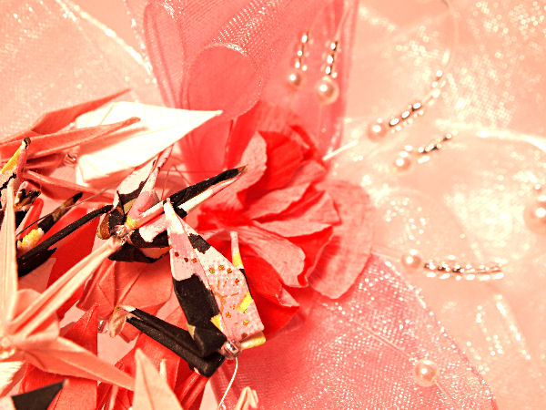 折り鶴をモチーフにした髪飾りです。約40羽の折り鶴は、一つ一つ心をこめて手作りで作成しております。お祝い事や和装でのアクセサリーとして、お楽しみください。